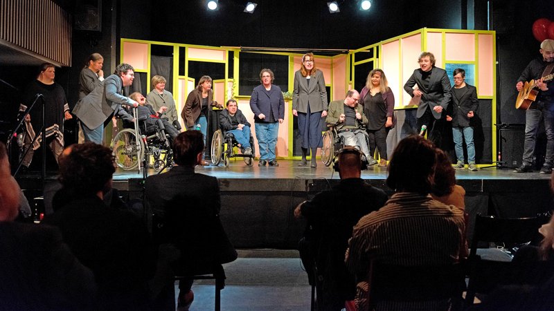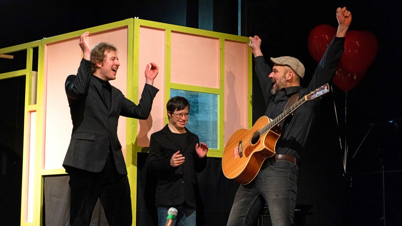 Das Klabauter-Ensemble auf seiner Bühne. Das Bühnenbild gehört zu dem aktuellen Stück 2050.