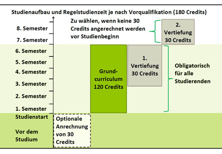 Unabhängig von Ihrer Studiendauer sind insgesamt 180 Creditpoints zu erwerben. Obligatorisch für alle Studierenden ist das Grundcurriculum, das sich über sechs Semester erstreckt und 120 Credits umfasst.