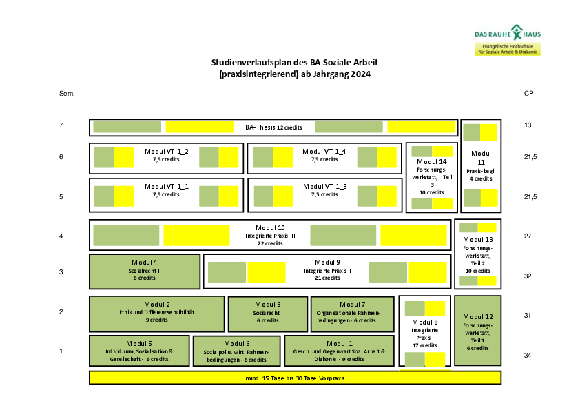 Der Inhalt des praxisintegrierenden Studiums der Sozialen Arbeit setzt sich aus zwei Bestandteilen zusammen. Im Grundcurriculum erwerben Sie über die Dauer des gesamten Studiums 138 Credits. Dieses setzt sich aus folgenden 14 Modulen zusammen: